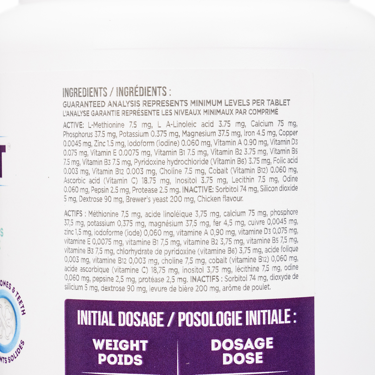 Ubavet Multivitamin for dogs is a comprehensive multivitamin supplement, providing a balance of vitamins and minerals to promote vitality, general health and a strong immune system. Ingredients: Microcrystalline cellulose, dehydrated chicken liver, brewers dried yeast,tricalcium phosphate, stearic acid, magnesium oxide, vegetable stearate, dried kelp (source of iodine), choline bitartrate, Ascorbic acid (Vitamin C), iron proteinate, zinc gluconate, thiamine mononitrate, Niacinamide, d-calcium pentothenate, betaine hydrochloride, DL-Methionine, Lecithin, Vitamin E supplement, Vitamin E, Riboflavin (Vitamin B2), pyridoxine HCl, p-aminobenzoic acid, linoleic acid, inositol, lipase (from aspergillus oryzae), pepsin, protease enzymes, bromelain, Vitamin A, dried carrot powder, potassium citrate, Vitamin D3, biotin, Vitamin B12 supplement, cobalt, carbonate, copper gluconate, sodium selenite, folic acid.