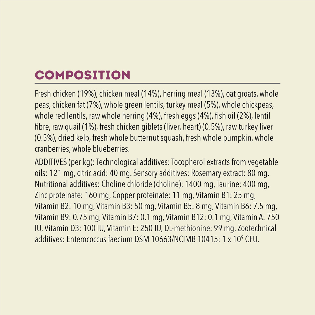 Fresh chicken (19%), chicken meal (14%), herring meal (13%), oat groats, whole peas, chicken fat (7%), whole green lentils, turkey meal (5%), whole chickpeas, whole red lentils, raw whole herring (4%), fresh eggs (4%), fish oil (2%), lentil fibre, raw quail (1%), fresh chicken giblets (liver, heart) (0.5%), raw turkey liver (0.5%), dried kelp, fresh whole butternut squash, fresh whole pumpkin, whole cranberries, whole blueberries.