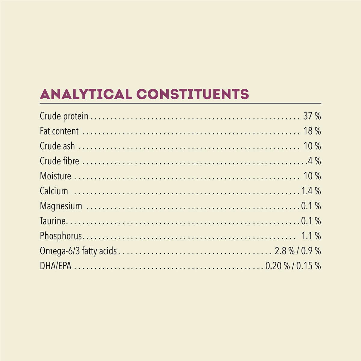 ADDITIVES (per kg): Technological additives: Tocopherol extracts from vegetable oils: 121 mg, citric acid: 40 mg. Sensory additives: Rosemary extract: 80 mg. Nutritional additives: Choline chloride (choline): 1400 mg, Taurine: 400 mg, Zinc proteinate: 160 mg, Copper proteinate: 11 mg, Vitamin B1: 25 mg, Vitamin B2: 10 mg, Vitamin B3: 50 mg, Vitamin B5: 8 mg, Vitamin B6: 7.5 mg, Vitamin B9: 0.75 mg, Vitamin B7: 0.1 mg, Vitamin B12: 0.1 mg, Vitamin A: 750 IU, Vitamin D3: 100 IU, Vitamin E: 250 IU, DL-methionine: 99 mg. Zootechnical additives: Enterococcus faecium DSM 10663/NCIMB 10415: 1 x 10? CFU
