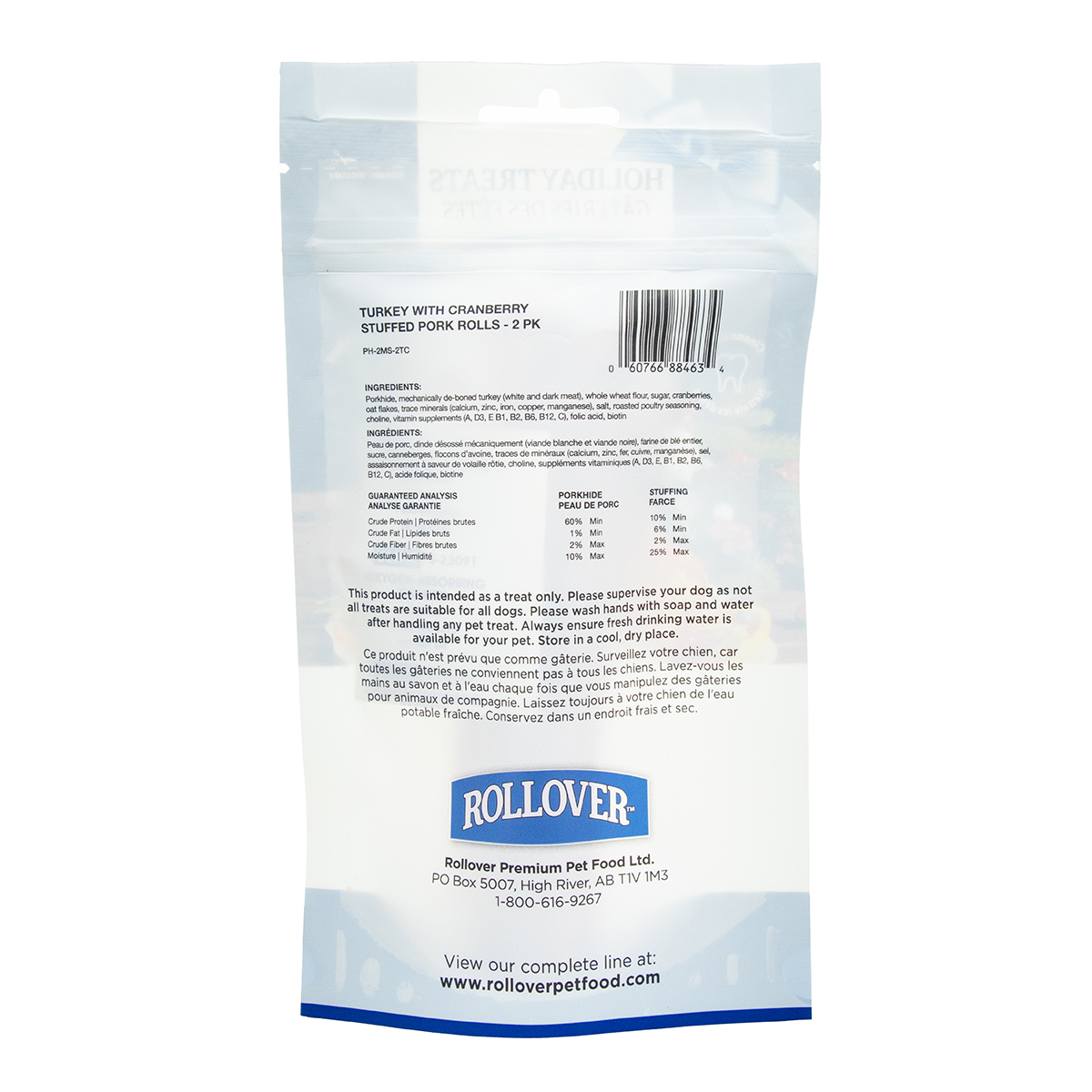 Rollover's Turkey & Cranberry Stuffed Pork Rolls consist of low fat porkhide filled with Rollover’s delicious, natural Turkey & Cranberry stuffing and then carefully baked to be a scrumptious and nutritious chew treat. Porkhide is a much healthier alternative to traditional beef rawhide and with the added bonus of Turkey & Cranberry filling, these treats are sure to be a hit with dogs!